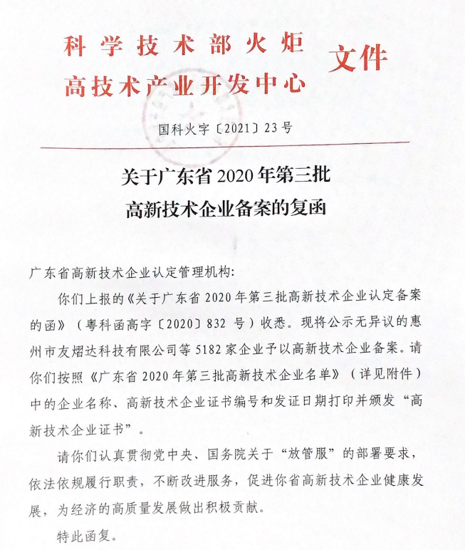 繼我司入圍“三個一批”的“兩高四新(專精特新)”企業(yè)名單后,1月15日又傳來《關于廣東省2020年第三批高新技術企業(yè)備案的復函》的公告消息,我司第三次成功入圍廣東省2020年第三批高新技術企業(yè)名單,由此代表我司企業(yè)發(fā)展和企業(yè)成就獲得了行業(yè)的高度認可。