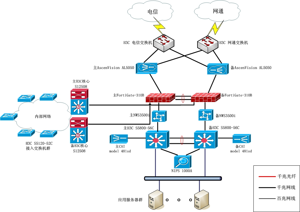 該客戶選擇了我司的解決方案來構筑。企業(yè)網(wǎng)核心采用兩臺H3C S12508萬兆核心路由交換機互相備份和冗余;終端接入采用多臺H3C S5120-52C交換機;服務器區(qū)域采用H3C S5800-56C交換機接入,配合CAI 481SD服務器負載均衡分導流量;趨勢NWS3500I防毒墻、綠盟 NIPS 1000A入侵防御保證服務器安全;FORTIGATE 310B防火墻保護出口邊界安全,外網(wǎng)ISP線路由AscenVision AL5050實現(xiàn)鏈路負載均衡。