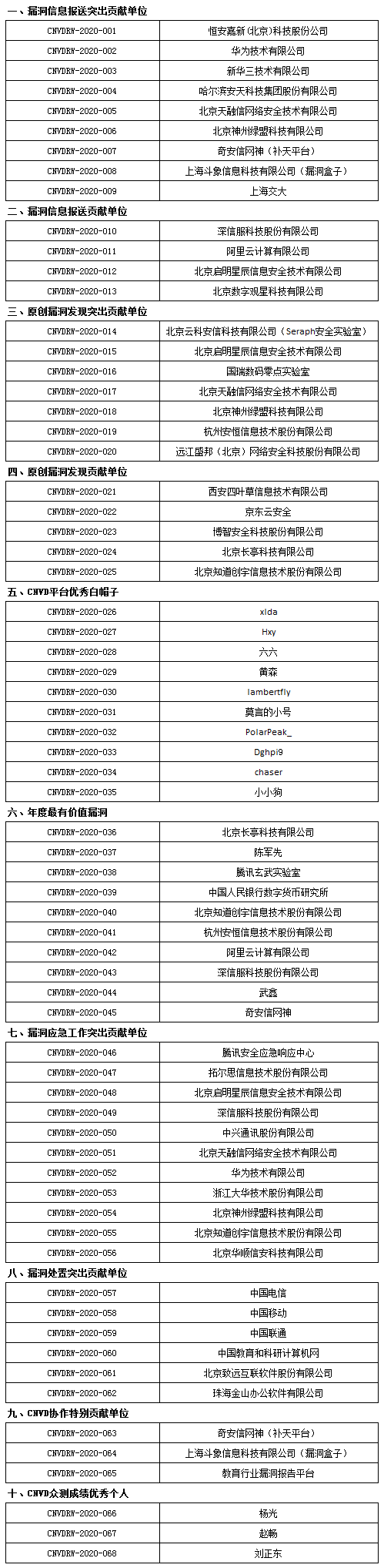 會議總結(jié)了CNVD平臺在2020年的工作情況,并對40家CNVD優(yōu)秀成員單位和行業(yè)單位,以及10名優(yōu)秀白帽子進行了表彰(名單附后)。此外,來自綠盟科技、數(shù)字觀星、深信服、騰訊玄武、遠江盛邦、杭州安恒和啟明星辰的網(wǎng)絡(luò)安全企業(yè)專家從漏洞防御、驗證代碼規(guī)范、攻擊威脅感知、漏洞挖掘、防護安全、瀏覽器安全、工業(yè)機器人安全等角度分享了技術(shù)報告與觀點。