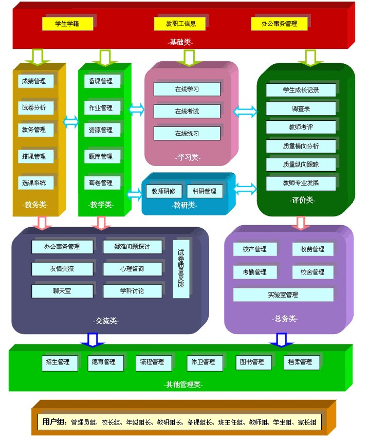 系統(tǒng)提供了滿足學(xué)校排課、選課、考務(wù)等教務(wù)管理、辦公事務(wù)管理、在線考試、備課管理、教師研修、資源管理、科研管理、教師研修、考勤管理、收費管理、校產(chǎn)管理、宿舍管理、實驗室管理、體衛(wèi)管理、招生管理、流程管理、德育管理、圖書管理、檔案管理等需要的功能強大的應(yīng)用模塊,為學(xué)校建立一個覆蓋范圍廣、實用性強的教育管理平臺;為教育精細化管理提供有效的評測依據(jù)。